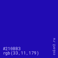 Цвет #210BB3 в цветовой модели RGB обозначается тремя октетами (33, 11, 179) в десятичном формате и #210BB3 в шестнадцатиричном (hex) формате, которые являются интенсивностью красного 33 (hex 21), интенсивность зелёного 11 (hex 0B) и интенсивность синего 179 (hex B3).