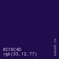 Цвет #210C4D в цветовой модели RGB обозначается тремя октетами (33, 12, 77) в десятичном формате и #210C4D в шестнадцатиричном (hex) формате, которые являются интенсивностью красного 33 (hex 21), интенсивность зелёного 12 (hex 0C) и интенсивность синего 77 (hex 4D).