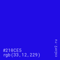 Цвет #210CE5 в цветовой модели RGB обозначается тремя октетами (33, 12, 229) в десятичном формате и #210CE5 в шестнадцатиричном (hex) формате, которые являются интенсивностью красного 33 (hex 21), интенсивность зелёного 12 (hex 0C) и интенсивность синего 229 (hex E5).