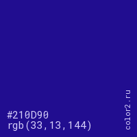 Цвет #210D90 в цветовой модели RGB обозначается тремя октетами (33, 13, 144) в десятичном формате и #210D90 в шестнадцатиричном (hex) формате, которые являются интенсивностью красного 33 (hex 21), интенсивность зелёного 13 (hex 0D) и интенсивность синего 144 (hex 90).