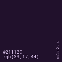 Цвет #21112C в цветовой модели RGB обозначается тремя октетами (33, 17, 44) в десятичном формате и #21112C в шестнадцатиричном (hex) формате, которые являются интенсивностью красного 33 (hex 21), интенсивность зелёного 17 (hex 11) и интенсивность синего 44 (hex 2C).