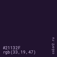 Цвет #21132F в цветовой модели RGB обозначается тремя октетами (33, 19, 47) в десятичном формате и #21132F в шестнадцатиричном (hex) формате, которые являются интенсивностью красного 33 (hex 21), интенсивность зелёного 19 (hex 13) и интенсивность синего 47 (hex 2F).