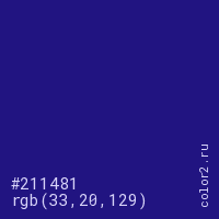 Цвет #211481 в цветовой модели RGB обозначается тремя октетами (33, 20, 129) в десятичном формате и #211481 в шестнадцатиричном (hex) формате, которые являются интенсивностью красного 33 (hex 21), интенсивность зелёного 20 (hex 14) и интенсивность синего 129 (hex 81).