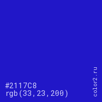 Цвет #2117C8 в цветовой модели RGB обозначается тремя октетами (33, 23, 200) в десятичном формате и #2117C8 в шестнадцатиричном (hex) формате, которые являются интенсивностью красного 33 (hex 21), интенсивность зелёного 23 (hex 17) и интенсивность синего 200 (hex C8).