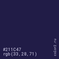 Цвет #211C47 в цветовой модели RGB обозначается тремя октетами (33, 28, 71) в десятичном формате и #211C47 в шестнадцатиричном (hex) формате, которые являются интенсивностью красного 33 (hex 21), интенсивность зелёного 28 (hex 1C) и интенсивность синего 71 (hex 47).