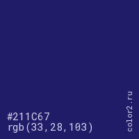 Цвет #211C67 в цветовой модели RGB обозначается тремя октетами (33, 28, 103) в десятичном формате и #211C67 в шестнадцатиричном (hex) формате, которые являются интенсивностью красного 33 (hex 21), интенсивность зелёного 28 (hex 1C) и интенсивность синего 103 (hex 67).