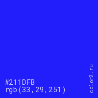 Цвет #211DFB в цветовой модели RGB обозначается тремя октетами (33, 29, 251) в десятичном формате и #211DFB в шестнадцатиричном (hex) формате, которые являются интенсивностью красного 33 (hex 21), интенсивность зелёного 29 (hex 1D) и интенсивность синего 251 (hex FB).