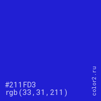 Цвет #211FD3 в цветовой модели RGB обозначается тремя октетами (33, 31, 211) в десятичном формате и #211FD3 в шестнадцатиричном (hex) формате, которые являются интенсивностью красного 33 (hex 21), интенсивность зелёного 31 (hex 1F) и интенсивность синего 211 (hex D3).