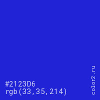 Цвет #2123D6 в цветовой модели RGB обозначается тремя октетами (33, 35, 214) в десятичном формате и #2123D6 в шестнадцатиричном (hex) формате, которые являются интенсивностью красного 33 (hex 21), интенсивность зелёного 35 (hex 23) и интенсивность синего 214 (hex D6).