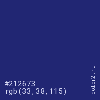 Цвет #212673 в цветовой модели RGB обозначается тремя октетами (33, 38, 115) в десятичном формате и #212673 в шестнадцатиричном (hex) формате, которые являются интенсивностью красного 33 (hex 21), интенсивность зелёного 38 (hex 26) и интенсивность синего 115 (hex 73).