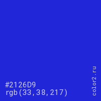Цвет #2126D9 в цветовой модели RGB обозначается тремя октетами (33, 38, 217) в десятичном формате и #2126D9 в шестнадцатиричном (hex) формате, которые являются интенсивностью красного 33 (hex 21), интенсивность зелёного 38 (hex 26) и интенсивность синего 217 (hex D9).