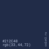 Цвет #212C48 в цветовой модели RGB обозначается тремя октетами (33, 44, 72) в десятичном формате и #212C48 в шестнадцатиричном (hex) формате, которые являются интенсивностью красного 33 (hex 21), интенсивность зелёного 44 (hex 2C) и интенсивность синего 72 (hex 48).