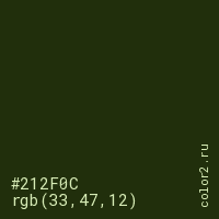 Цвет #212F0C в цветовой модели RGB обозначается тремя октетами (33, 47, 12) в десятичном формате и #212F0C в шестнадцатиричном (hex) формате, которые являются интенсивностью красного 33 (hex 21), интенсивность зелёного 47 (hex 2F) и интенсивность синего 12 (hex 0C).