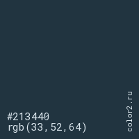 Цвет #213440 в цветовой модели RGB обозначается тремя октетами (33, 52, 64) в десятичном формате и #213440 в шестнадцатиричном (hex) формате, которые являются интенсивностью красного 33 (hex 21), интенсивность зелёного 52 (hex 34) и интенсивность синего 64 (hex 40).