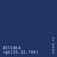 Цвет #213464 в цветовой модели RGB обозначается тремя октетами (33, 52, 100) в десятичном формате и #213464 в шестнадцатиричном (hex) формате, которые являются интенсивностью красного 33 (hex 21), интенсивность зелёного 52 (hex 34) и интенсивность синего 100 (hex 64).