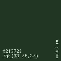 Цвет #213723 в цветовой модели RGB обозначается тремя октетами (33, 55, 35) в десятичном формате и #213723 в шестнадцатиричном (hex) формате, которые являются интенсивностью красного 33 (hex 21), интенсивность зелёного 55 (hex 37) и интенсивность синего 35 (hex 23).