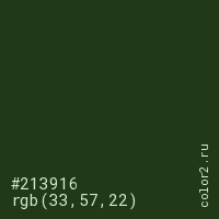 Цвет #213916 в цветовой модели RGB обозначается тремя октетами (33, 57, 22) в десятичном формате и #213916 в шестнадцатиричном (hex) формате, которые являются интенсивностью красного 33 (hex 21), интенсивность зелёного 57 (hex 39) и интенсивность синего 22 (hex 16).