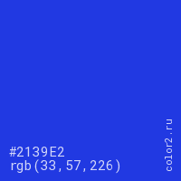 Цвет #2139E2 в цветовой модели RGB обозначается тремя октетами (33, 57, 226) в десятичном формате и #2139E2 в шестнадцатиричном (hex) формате, которые являются интенсивностью красного 33 (hex 21), интенсивность зелёного 57 (hex 39) и интенсивность синего 226 (hex E2).