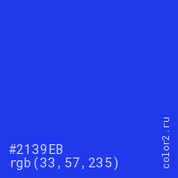 Цвет #2139EB в цветовой модели RGB обозначается тремя октетами (33, 57, 235) в десятичном формате и #2139EB в шестнадцатиричном (hex) формате, которые являются интенсивностью красного 33 (hex 21), интенсивность зелёного 57 (hex 39) и интенсивность синего 235 (hex EB).