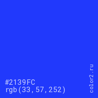 Цвет #2139FC в цветовой модели RGB обозначается тремя октетами (33, 57, 252) в десятичном формате и #2139FC в шестнадцатиричном (hex) формате, которые являются интенсивностью красного 33 (hex 21), интенсивность зелёного 57 (hex 39) и интенсивность синего 252 (hex FC).