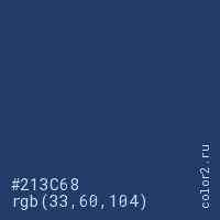 Цвет #213C68 в цветовой модели RGB обозначается тремя октетами (33, 60, 104) в десятичном формате и #213C68 в шестнадцатиричном (hex) формате, которые являются интенсивностью красного 33 (hex 21), интенсивность зелёного 60 (hex 3C) и интенсивность синего 104 (hex 68).