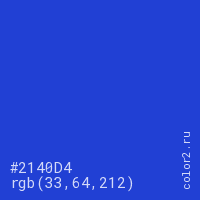 Цвет #2140D4 в цветовой модели RGB обозначается тремя октетами (33, 64, 212) в десятичном формате и #2140D4 в шестнадцатиричном (hex) формате, которые являются интенсивностью красного 33 (hex 21), интенсивность зелёного 64 (hex 40) и интенсивность синего 212 (hex D4).