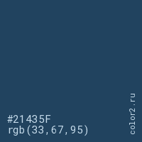 Цвет #21435F в цветовой модели RGB обозначается тремя октетами (33, 67, 95) в десятичном формате и #21435F в шестнадцатиричном (hex) формате, которые являются интенсивностью красного 33 (hex 21), интенсивность зелёного 67 (hex 43) и интенсивность синего 95 (hex 5F).