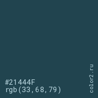 Цвет #21444F в цветовой модели RGB обозначается тремя октетами (33, 68, 79) в десятичном формате и #21444F в шестнадцатиричном (hex) формате, которые являются интенсивностью красного 33 (hex 21), интенсивность зелёного 68 (hex 44) и интенсивность синего 79 (hex 4F).