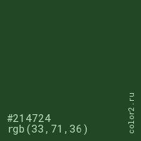 Цвет #214724 в цветовой модели RGB обозначается тремя октетами (33, 71, 36) в десятичном формате и #214724 в шестнадцатиричном (hex) формате, которые являются интенсивностью красного 33 (hex 21), интенсивность зелёного 71 (hex 47) и интенсивность синего 36 (hex 24).