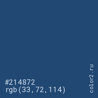 Цвет #214872 в цветовой модели RGB обозначается тремя октетами (33, 72, 114) в десятичном формате и #214872 в шестнадцатиричном (hex) формате, которые являются интенсивностью красного 33 (hex 21), интенсивность зелёного 72 (hex 48) и интенсивность синего 114 (hex 72).