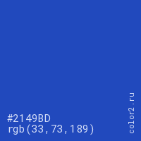 Цвет #2149BD в цветовой модели RGB обозначается тремя октетами (33, 73, 189) в десятичном формате и #2149BD в шестнадцатиричном (hex) формате, которые являются интенсивностью красного 33 (hex 21), интенсивность зелёного 73 (hex 49) и интенсивность синего 189 (hex BD).
