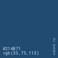 Цвет #214B71 в цветовой модели RGB обозначается тремя октетами (33, 75, 113) в десятичном формате и #214B71 в шестнадцатиричном (hex) формате, которые являются интенсивностью красного 33 (hex 21), интенсивность зелёного 75 (hex 4B) и интенсивность синего 113 (hex 71).