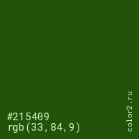 Цвет #215409 в цветовой модели RGB обозначается тремя октетами (33, 84, 9) в десятичном формате и #215409 в шестнадцатиричном (hex) формате, которые являются интенсивностью красного 33 (hex 21), интенсивность зелёного 84 (hex 54) и интенсивность синего 9 (hex 09).