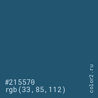 Цвет #215570 в цветовой модели RGB обозначается тремя октетами (33, 85, 112) в десятичном формате и #215570 в шестнадцатиричном (hex) формате, которые являются интенсивностью красного 33 (hex 21), интенсивность зелёного 85 (hex 55) и интенсивность синего 112 (hex 70).