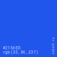 Цвет #2156ED в цветовой модели RGB обозначается тремя октетами (33, 86, 237) в десятичном формате и #2156ED в шестнадцатиричном (hex) формате, которые являются интенсивностью красного 33 (hex 21), интенсивность зелёного 86 (hex 56) и интенсивность синего 237 (hex ED).