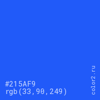 Цвет #215AF9 в цветовой модели RGB обозначается тремя октетами (33, 90, 249) в десятичном формате и #215AF9 в шестнадцатиричном (hex) формате, которые являются интенсивностью красного 33 (hex 21), интенсивность зелёного 90 (hex 5A) и интенсивность синего 249 (hex F9).