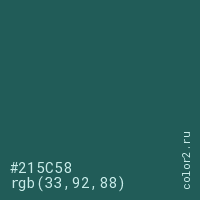 Цвет #215C58 в цветовой модели RGB обозначается тремя октетами (33, 92, 88) в десятичном формате и #215C58 в шестнадцатиричном (hex) формате, которые являются интенсивностью красного 33 (hex 21), интенсивность зелёного 92 (hex 5C) и интенсивность синего 88 (hex 58).