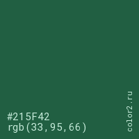 Цвет #215F42 в цветовой модели RGB обозначается тремя октетами (33, 95, 66) в десятичном формате и #215F42 в шестнадцатиричном (hex) формате, которые являются интенсивностью красного 33 (hex 21), интенсивность зелёного 95 (hex 5F) и интенсивность синего 66 (hex 42).