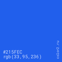 Цвет #215FEC в цветовой модели RGB обозначается тремя октетами (33, 95, 236) в десятичном формате и #215FEC в шестнадцатиричном (hex) формате, которые являются интенсивностью красного 33 (hex 21), интенсивность зелёного 95 (hex 5F) и интенсивность синего 236 (hex EC).