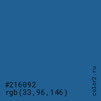 Цвет #216092 в цветовой модели RGB обозначается тремя октетами (33, 96, 146) в десятичном формате и #216092 в шестнадцатиричном (hex) формате, которые являются интенсивностью красного 33 (hex 21), интенсивность зелёного 96 (hex 60) и интенсивность синего 146 (hex 92).