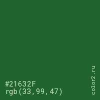 Цвет #21632F в цветовой модели RGB обозначается тремя октетами (33, 99, 47) в десятичном формате и #21632F в шестнадцатиричном (hex) формате, которые являются интенсивностью красного 33 (hex 21), интенсивность зелёного 99 (hex 63) и интенсивность синего 47 (hex 2F).