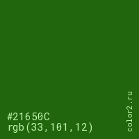 Цвет #21650C в цветовой модели RGB обозначается тремя октетами (33, 101, 12) в десятичном формате и #21650C в шестнадцатиричном (hex) формате, которые являются интенсивностью красного 33 (hex 21), интенсивность зелёного 101 (hex 65) и интенсивность синего 12 (hex 0C).