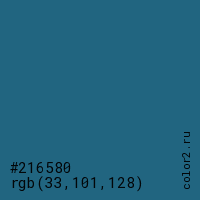 Цвет #216580 в цветовой модели RGB обозначается тремя октетами (33, 101, 128) в десятичном формате и #216580 в шестнадцатиричном (hex) формате, которые являются интенсивностью красного 33 (hex 21), интенсивность зелёного 101 (hex 65) и интенсивность синего 128 (hex 80).