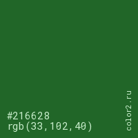 Цвет #216628 в цветовой модели RGB обозначается тремя октетами (33, 102, 40) в десятичном формате и #216628 в шестнадцатиричном (hex) формате, которые являются интенсивностью красного 33 (hex 21), интенсивность зелёного 102 (hex 66) и интенсивность синего 40 (hex 28).