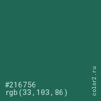 Цвет #216756 в цветовой модели RGB обозначается тремя октетами (33, 103, 86) в десятичном формате и #216756 в шестнадцатиричном (hex) формате, которые являются интенсивностью красного 33 (hex 21), интенсивность зелёного 103 (hex 67) и интенсивность синего 86 (hex 56).
