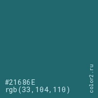 Цвет #21686E в цветовой модели RGB обозначается тремя октетами (33, 104, 110) в десятичном формате и #21686E в шестнадцатиричном (hex) формате, которые являются интенсивностью красного 33 (hex 21), интенсивность зелёного 104 (hex 68) и интенсивность синего 110 (hex 6E).