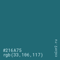 Цвет #216A75 в цветовой модели RGB обозначается тремя октетами (33, 106, 117) в десятичном формате и #216A75 в шестнадцатиричном (hex) формате, которые являются интенсивностью красного 33 (hex 21), интенсивность зелёного 106 (hex 6A) и интенсивность синего 117 (hex 75).