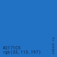 Цвет #2171C5 в цветовой модели RGB обозначается тремя октетами (33, 113, 197) в десятичном формате и #2171C5 в шестнадцатиричном (hex) формате, которые являются интенсивностью красного 33 (hex 21), интенсивность зелёного 113 (hex 71) и интенсивность синего 197 (hex C5).