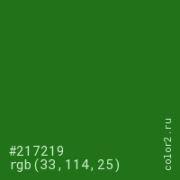Цвет #217219 в цветовой модели RGB обозначается тремя октетами (33, 114, 25) в десятичном формате и #217219 в шестнадцатиричном (hex) формате, которые являются интенсивностью красного 33 (hex 21), интенсивность зелёного 114 (hex 72) и интенсивность синего 25 (hex 19).