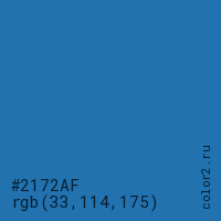 Цвет #2172AF в цветовой модели RGB обозначается тремя октетами (33, 114, 175) в десятичном формате и #2172AF в шестнадцатиричном (hex) формате, которые являются интенсивностью красного 33 (hex 21), интенсивность зелёного 114 (hex 72) и интенсивность синего 175 (hex AF).